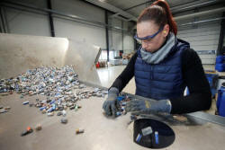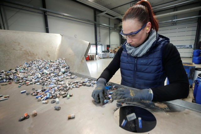 An employee sorts used primary non-rechargeable Lithium-ion