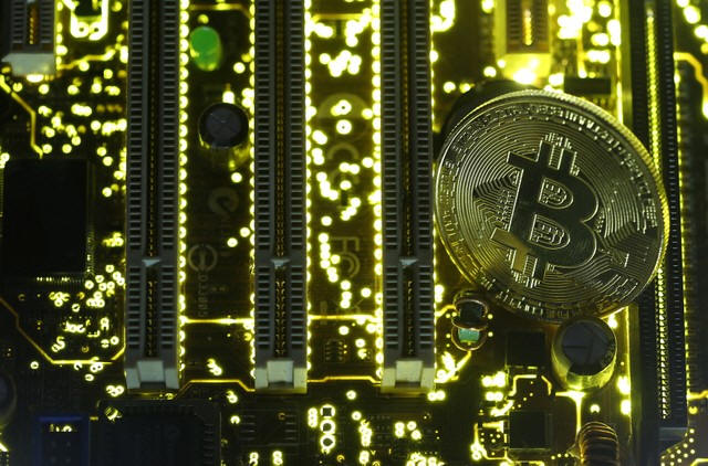 A copy of bitcoin standing on PC motherboard is seen in this