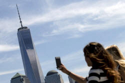 A woman uses her phone to photograph One World Trade Center tower in