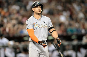 Miami Marlins right fielder Giancarlo Stanton (27) flips his bat