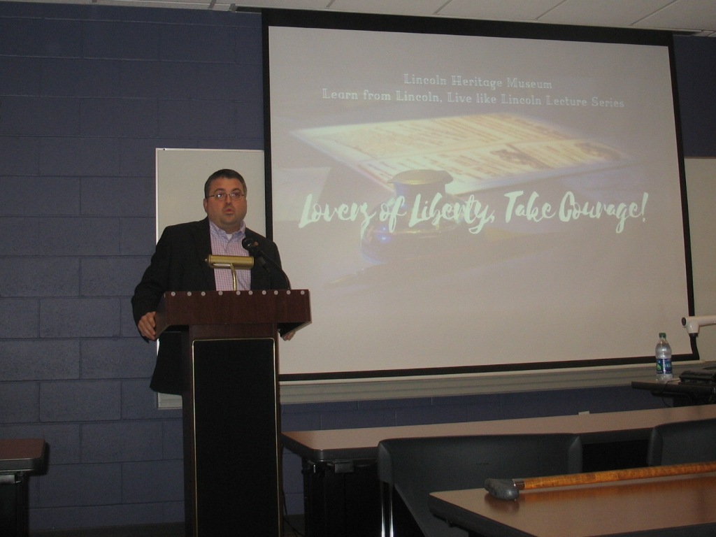 Lincoln Heritage Museum Director Tom McLaughlin introduced Dr. Wheeler. Wheeler is the Illinois State Historian and serves as the Director of research, collections, and library services at the Abraham Lincoln Presidential Library and Museum in Springfield. Wheeler specializes in the history of Illinois, the Civil War era, and the life and legacy of Abraham Lincoln, and is the historian of record for the state's 56 historic sites.