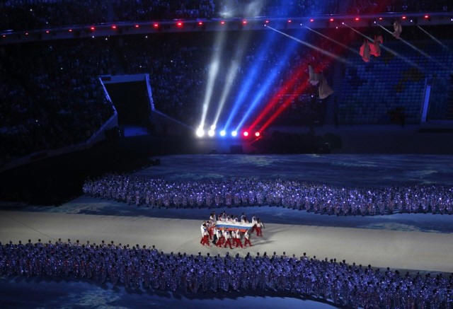 Russian athletes carry their national flag into the stadium during