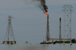 A boat is seen close to oil installations at Lake Maracaibo in