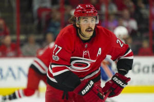 Hurricanes defensemen Justin Faulk (27) looks on against the New