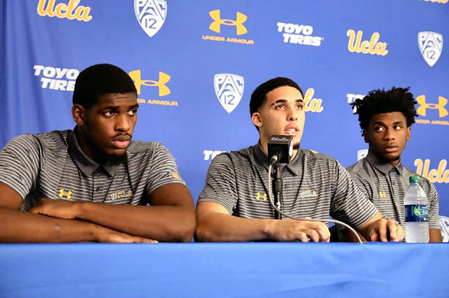 UCLA basketball players Cody Riley, LiAngelo Ball and Jalen Hill