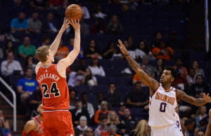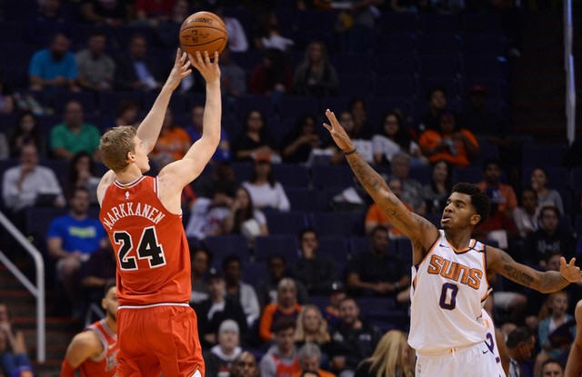 Bulls forward Lauri Markkanen (24) shoots over Phoenix Suns forward