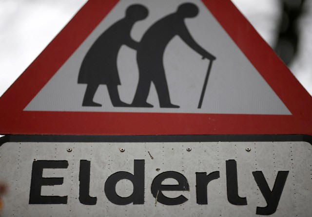 A road sign warning drivers of elderly people crossing the road is