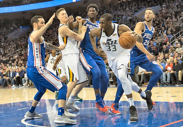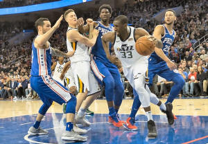 Jazz center Ekpe Udoh (33) dribbles the ball around Philadelphia