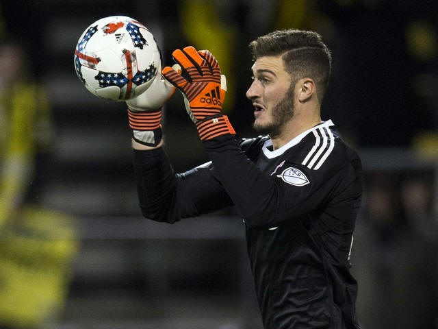 Toronto FC goalkeeper Alex Bono (25) makes a save against Columbus