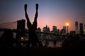 in front of the Brooklyn Bridge and the Lower Manhattan skyline from