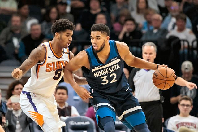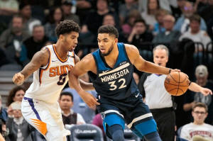Timberwolves center Karl-Anthony Towns (32) dribbles in the third