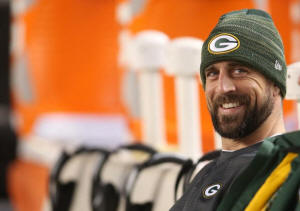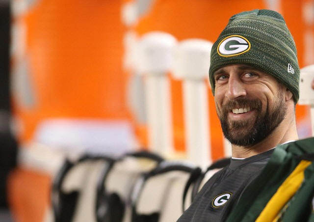 Packers quarterback Aaron Rodgers (12) smiles on the bench before