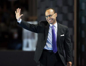 Representative Luis Gutierrez (D-IL) waves after speaking at the