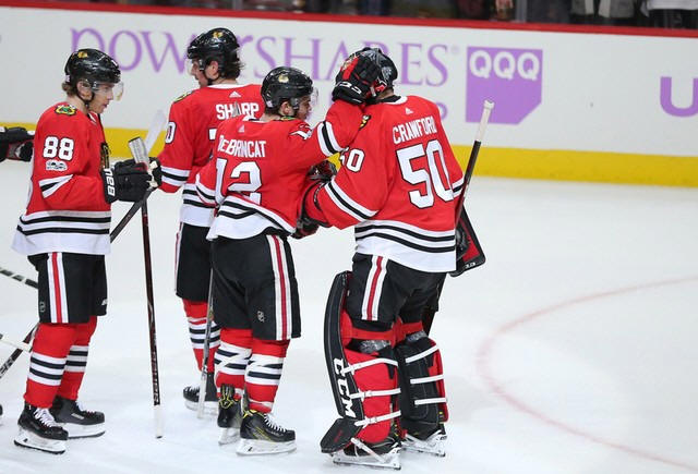 Blackhawks right wing Alex DeBrincat (12) congratulates goalie