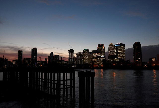 The Canary Wharf financial district is seen at dusk in London,