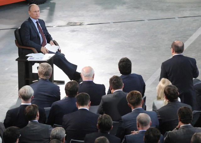 Russian President Vladimir Putin (L, top) meets with businessmen
