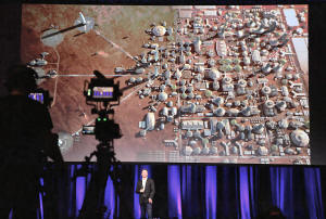 a screen displays a depiction of a human colony on the planet Mars
