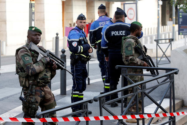 French police and soldier secure a street near the Saint-Charles train