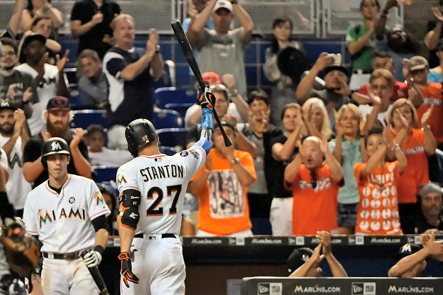 Marlins right fielder Giancarlo Stanton (27) waives to the fans
