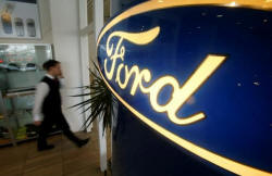 The logo of Ford Motor Company is on display at a dealership of