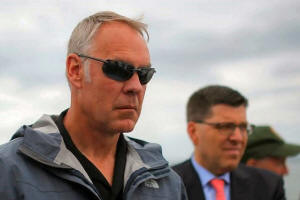 U.S. Interior Secretary Ryan Zinke rides a boat to Georges Island,