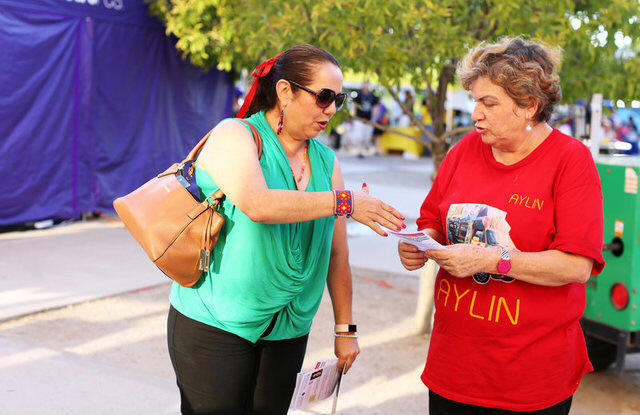 Campos de Marcorin (L) speaks to a food vendor about how to find