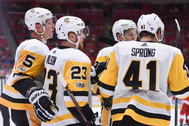Penguins center Scott Wilson (23) celebrates his goal with teammates