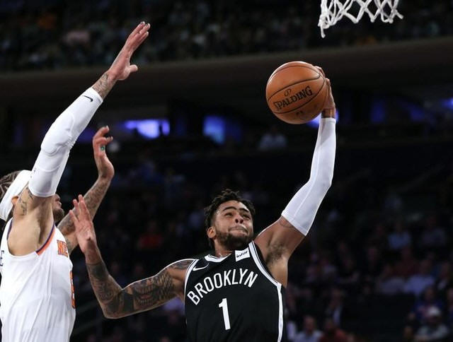 Nets guard D'Angelo Russell (1) drives to the basket against
