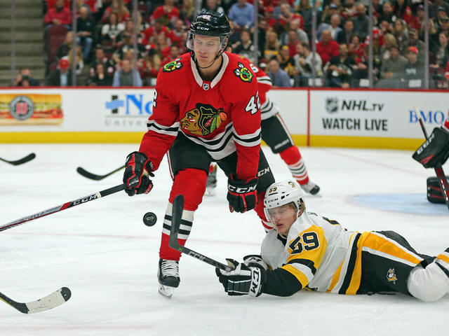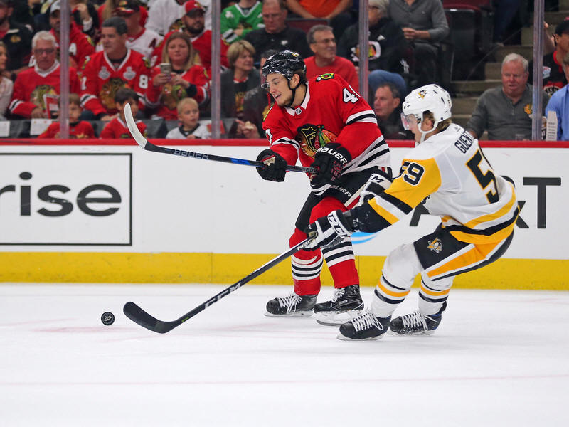 Blackhawks defenseman Gustav Forsling (42) and Pittsburgh Penguins