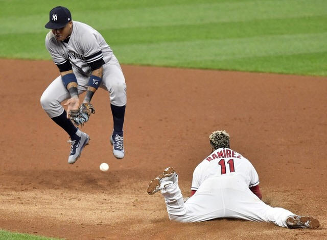 Indians third baseman Jose Ramirez (11) steals second base