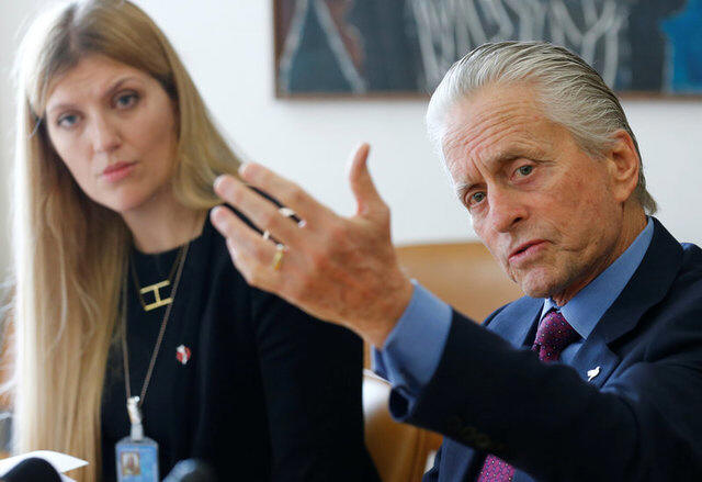 Peace Michael Douglas attend a news conference on nuclear