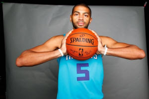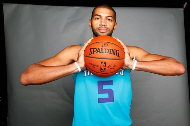 Hornets guard Nicolas Batum (5) poses for a picture during Media Day