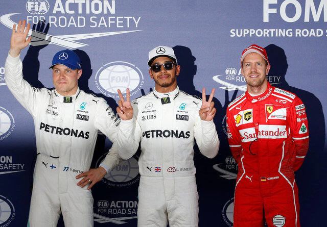 Mercedes' Lewis Hamilton of Britain celebrates pole position in