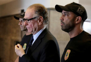 leaves the Federal Police headquarters heading to jail, in Rio de