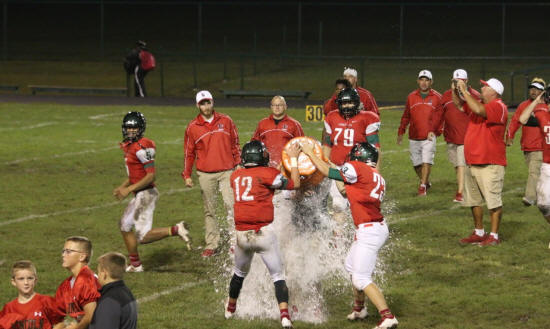 congratulated by defenseman Steven Kampfer (47) after defeating
