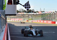 Mercedes' British driver Lewis Hamilton crosses the finish line