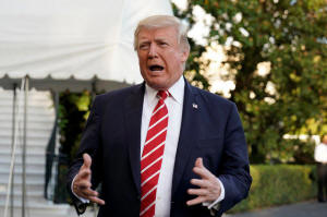 President Donald Trump talks to the media on South Lawn of the White