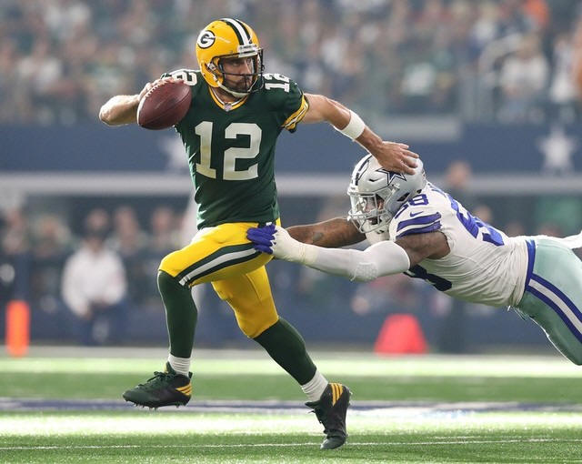 Packers quarterback Aaron Rodgers (12) scrambles away from Dallas