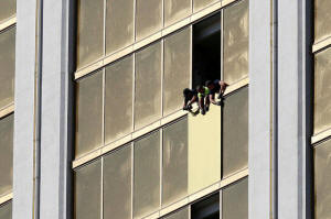 Workers board up a broken window at the Mandalay Bay hotel, where