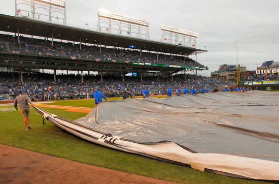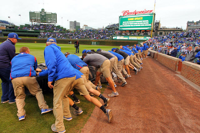Chicago Cubs grounds crew roll out the tarp before game