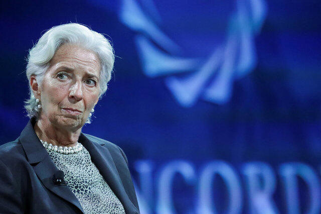 Christine Lagarde, Managing Director of the IMF, listens a question