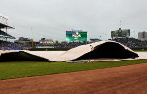 crew roll out the tarp before game four of the 2017 NLDS playoff