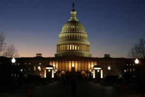 The U.S. Capitol Building is lit at sunset in Washington, U.S.,