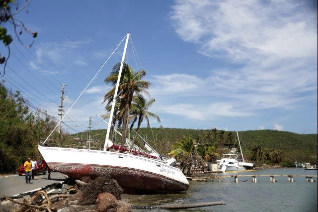 Men walk past a boat pushed onto a roadway by the winds of Hurricane