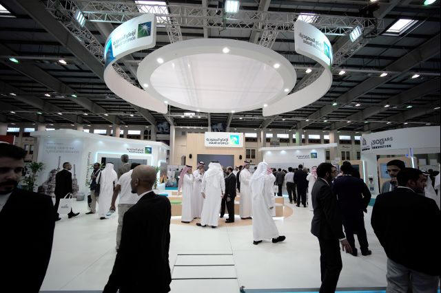 Visitors are seen at the Saudi Aramco stand at the Middle East