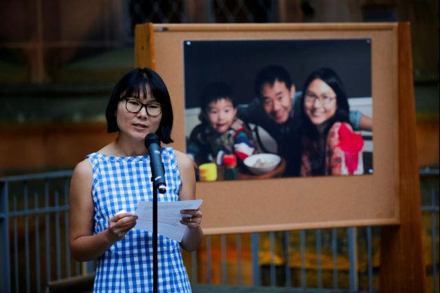 Hua Qu speaks to people as they attend a vigil for Xiyue Wang at