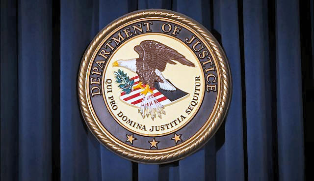 The Department of Justice (DOJ) logo is pictured on a wall after a