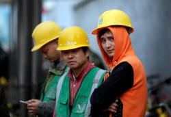 Workers rest outside a construction site in Beijing's central