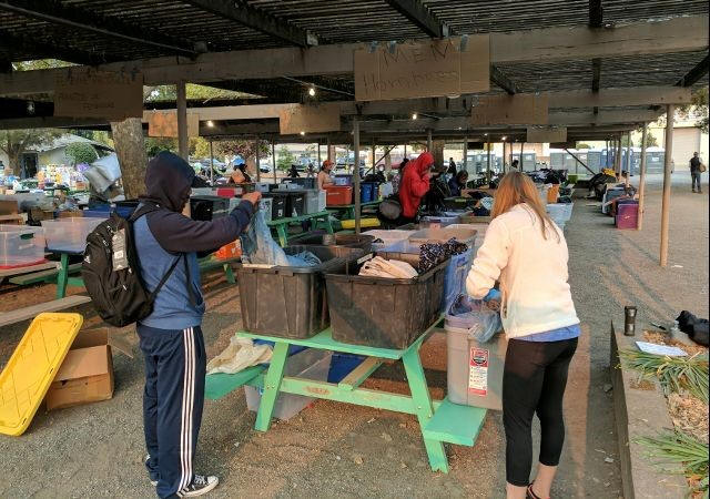 industries, sift through clothing at a shelter in Petaluma,