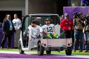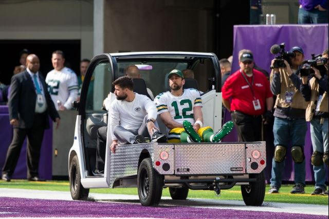 Packers quarterback Aaron Rodgers (12) is taken off the field on a